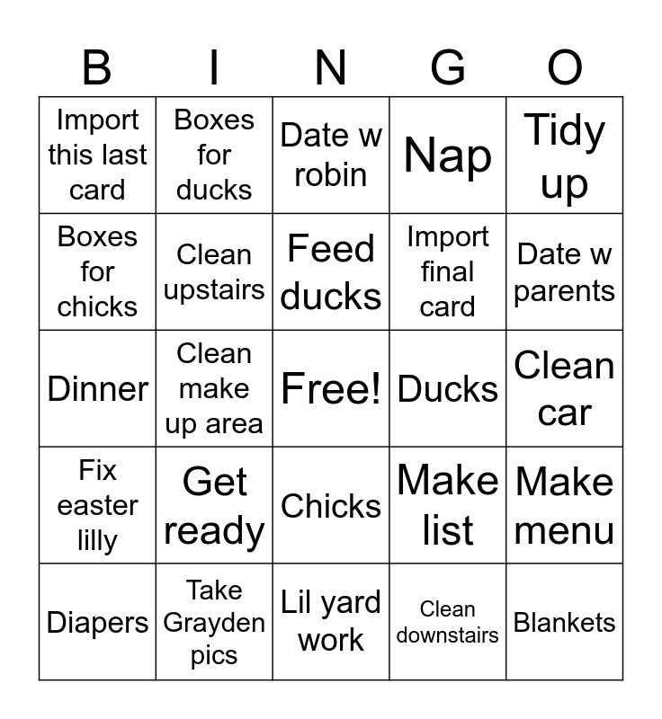This bingo card has a free space and 24 words: Get ready, Take Grayden pics, Feed ducks, Diapers, Tidy up, Import this last card, Boxes for chicks, Boxes for ducks, Ducks, Chicks, Import final card, Dinner, Make list, Make menu, Clean upstairs, Clean downstairs, Clean car, Date w robin, Date w parents, Clean make up area, Blankets, Fix easter lilly, Nap and Lil yard work.