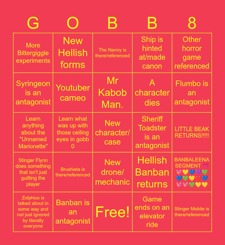 This bingo card has 25 words: Stinger Flynn does something that isn't just guilting the player, Banban is an antagonist, New character/ case, Game ends on an elevator ride, Other horror game referenced, More Bittergiggle experiments, New Hellish forms, The Nanny is there/referenced, Sheriff Toadster is an antagonist, BANBALEENA SEGMENT 💗💖💛💙💜💚💙💚💛❤️💙💖💖💚💛💛, Syringeon is an antagonist, Youtuber cameo, Free!, Hellish Banban returns, Flumbo is an antagonist, Zolphius is talked about in some way and not just ignored by literally everyone, Learn what was up with those ceiling eyes in gobb 0, Mr Kabob Man., A character dies, LITTLE BEAK RETURNS!!!!!, Learn anything about the "Unnamed Marionette", Brushista is there/referenced, New drone/ mechanic, Ship is hinted at/made canon and Stinger Mobile is there/referenced.