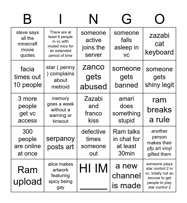 This bingo card has a free space and 24 words: Ram upload, serpanoy posts art, zanco gets abused, a new channel is made, zazabi cat keyboard, steve says all the minecraft movie quotes, There are at least 6 people in vc with muted mics for an extended period of time, someone active joins the server, amari does something stupid, ram breaks a rule, 3 more people get vc access, star ( penny ) complains about metroid, Ram talks in chat for at least 30min, another person makes their pfp art vinyl gifted them, facia times out 10 people, alice makes artwork featuring spicy being gay, HI IM ____, someone falls asleep in vc, someone gets shiny legit, 300 people are online at once, memory goes a week without a warning or timeout, defective times someone out, someone gets banned and someone plays star control 2 in vc. totally not an excuse to get people to play star control 2.