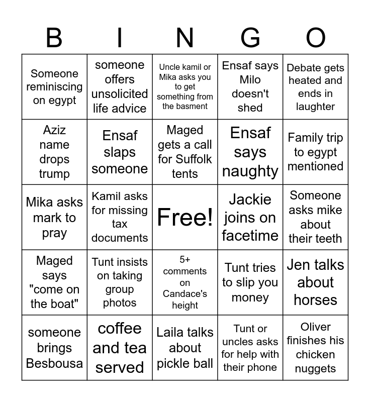This bingo card has a free space and 24 words: Tunt insists on taking group photos, coffee and tea served, Maged gets a call for Suffolk tents, someone brings Besbousa, Debate gets heated and ends in laughter, Someone reminiscing on egypt, Aziz name drops trump, someone offers unsolicited life advice, Jackie joins on facetime, 5+ comments on Candace's height, Ensaf says naughty, Mika asks mark to pray, Tunt tries to slip you money, Jen talks about horses, Ensaf slaps someone, Tunt or uncles asks for help with their phone, Someone asks mike about their teeth, Uncle kamil or Mika asks you to get something from the basment, Family trip to egypt mentioned, Kamil asks for missing tax documents, Oliver finishes his chicken nuggets, Maged says "come on the boat", Ensaf says Milo doesn't shed and Laila talks about pickle ball.