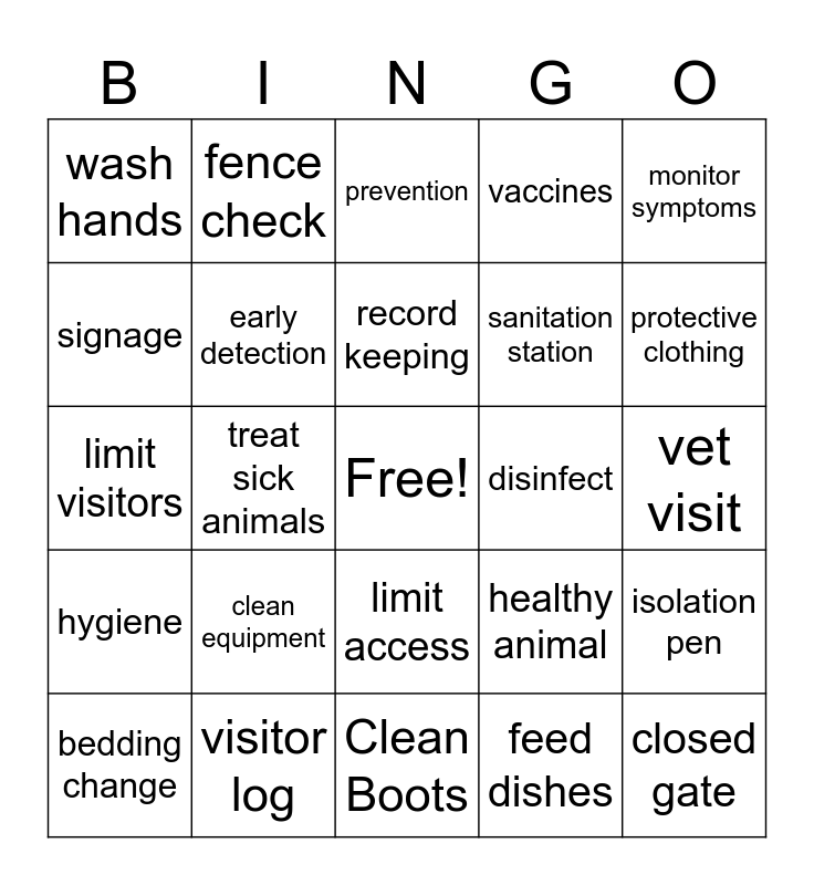 This bingo card has a free space and 31 words: Clean Boots, quarantine, treat sick animals, proper feed storage, wash hands, prevention, early detection, healthy animal, disinfect, feed dishes, vet visit, closed gate, biosecurity, clean water, protective clothing, pest control, isolation pen, clean equipment, hygiene, limit access, monitor symptoms, waste disposal, bedding change, fence check, sanitation station, signage, vaccines, limit visitors, visitor log, record keeping and animal stress.