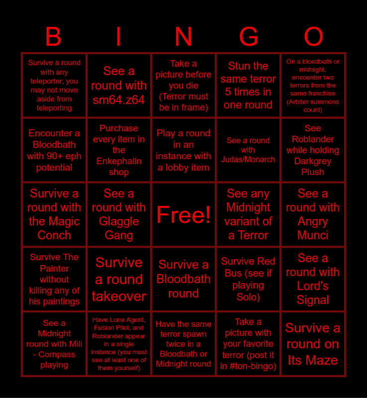 This bingo card has a free space and 144 words: See a round with Tiffany, Survive V2, Survive Mopemope, Survive Garten Goers, Survive Maul-a-Child, Survive Red Bus (see if playing Solo), Survive Don't Touch Me, Touch Don't Touch Me (activate), Survive Feddys, Survive TBH Spy, Survive Tragedy, Survive Rabid Snarbolax, Survive Paradise Bird, Survive Lisa, Enrage Mopemope, Survive Eggman's Announcement, Survive Mona and the Mountain, Survive Try Not To Touch Me, Survive Whiteface, Survive Furnace, See a round with Voidwalker, See a round with Lord's Signal, See a round with MR. MEGA, See a round with Decayed Sponge, See a round with Army in Black, See a round with Glaggle Gang, See a round with sm64.z64, See a round with The Red Mist, See a round with Apathy, See a round with Dev Maulers, See a round with Convict Squad, See a round with S.T.G.M., See a round with Sanic, See a round with Angry Munci, See a round with Ambush, See a round with Walpurgisnacht, See a round with Sakuya the Ripper, See a round with The Navigator, See a round with Judas/Monarch, See a round with Teuthida, See a round with either Lone Agent, Roblander, or Fusion Pilot, See either Mystic Moon, Blood Moon, Twilight, or Solstice, Survive a Bloodbath round, Survive a Fog Round, Survive an Alternate round, Survive a Punished Round, Survive a Cracked Round, Survive a Midnight Round, Survive RUN!, See a Round Takeover, Get the same type of special round 3 times in a row, Get the same Map twice in a row, See a Midnight round with Mili - Compass playing, See a special round on Challenge Cube, earn 10 sp in one instance, earn 50 sp, Hold 500 Eph at once, Hold 2500 Eph at once, Survive 5 rounds consecutively without respawning, Survive a round without an item (including Punished), Get script killed (no cheating), Take a picture with your favorite terror (post it in #ton-bingo), Survive a round with Maxwell equipped for the whole duration,, Survive Something or Whitenight after taking a Delicate Coil or Glass Coil into the round, Survive Faker after it enters its second phase naturally, Survive The Painter without killing any of his paintings, Survive a round with Medkit, Survive a round with Have's Brew or Blue Medkit, Survive a round with any stun weapon, Survive a round with any plush item, Survive a round with any teleporter, Survive a round with any teleporter, you may not move aside from teleporting, Survive a round with the Magic Conch, Survive a round with Twilight Coil, Survive DTM after it was activated, Survive a classic round by baiting their attacks (Sakuy skill issue, running through a terror with no contact damage, etc.), Die to Waterwraith when it spawns, Die to a damaging aura (excluding delicate coil), Stun the same terror 5 times in one round, Die to the Delicate coil at the start of a round, Stun Snarbolax, Get 5 beneficial effects from Beyond Plush/Have's Brew/Blue Medkit in a row; restart on negative effect, Die to the Interloper (no avatar seats), Survive Arkus with Divine Avenger, or Survive Arkus with Gran Faust after stunning it twice, See Roblander while holding Darkgrey Plush, Bring a sync item to the associated moon round (eg: Twilight Coil to Twilight), See any Midnight variant of a Terror, Play 5 rounds to completion (death or win) with no HUD or music, and with bloom at 0%, Have the same terror spawn twice in a Bloodbath or Midnight round, Collect 3 pages in a single 8 pages round, Get parried by a terror, Survive a twilight with Delicate coil, See a Midnight round with 200 or more Enkephalin potential, Have Lone Agent, Fusion Pilot, and Roblander appear in a single instance (you must see at least one of them yourself), Survive TBH or TBH Spy with TBH, Die to Furnace's ranged attack, Play item roulette for 10 consecutive rounds, Encounter a bloodbath with 45 eph potential or lower, Survive a round with a linked item skin (ie: Bloodbath with bloodstained teleporter), Survive Rush or Ambush without entering a closet, Encounter a Bloodbath with 90+ eph potential, Do nothing for a round and survive (you may jump once to avoid Specimen 9, but otherwise must stay where you spawned), Survive a round on Challenge Cube, Encounter Comedy and Tragedy in the same instance, Play a round in an instance with a lobby item, Play 10 consecutive rounds at the smallest avatar size, Survive a round on It’s Maze, Sign Beelzebub’s contract, Survive BFF with an item he has, Purchase every item in the Enkephalin shop, Survive Rush or Ambush without lockers, Take a picture before you die (Terror must be in frame), Survive Squidward without enraging him early, On a bloodbath or midnight, encounter two terrors from the same franchise (Arbiter summons count), Survive a round on Its Maze, Have Judgement Bird inflict Sin on you at least twice in the same round, Encounter 2 of the same moon in one lobby, Be set to 1 hp in any way (attack or on-sight damage), Survive a Bloodbath or Midnight with An Arbiter, Survive a Bloodbath or Midnight with at least 4 entites (excluding An Arbiter's summons), Survive a Bloodbath or Midnight with a line of sight terror, Hit Bad Batter or The Batter with any bat item, Encounter the same terror twice in a row, Stun all entities of a terror with multiple entities (ie: All-Around-Helpers), Survive a round on Iteration_0 while staying on the right side of the road, See any normal terror that gives an achievement, Get an achievement, Encounter a terror on a map from the same franchise (ie: Purple Guy on Pizzeria), Survive a round with a final eph potential of at least 80 (excluding Bloodbath and Midnight rounds), Survive Starved with only stun items equipped on all players, Watch the fish man dance of Fishbowl for the entire duration of its animation (you may do nothing else during this), Survive a round with Beyond Plush on Throne while staying in the throne room with the large Beyond Plush, Press all the buttons in Museum during a single round (excluding the one behind the fence), Stand on the