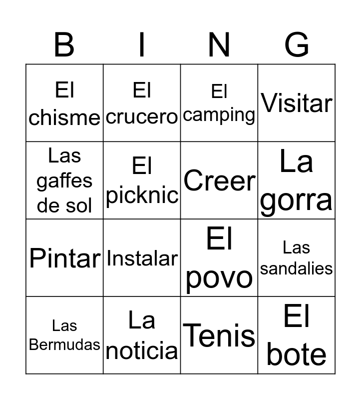This bingo card has a free space and 15 words: Las Bermudas, El bote, El camping, El chisme, La gorra, Las gaffes de sol, Instalar, Tenis, El picknic, Pintar, Las sandalies, Visitar, Creer, El crucero and La noticia.