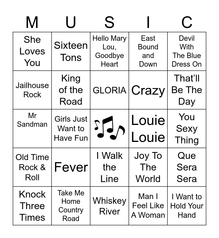 This bingo card has a free space and 60 words: Build Me Up Buttercup, Take Me Home Country Road, Twist & Shout, Old Time Rock & Roll, Man I Feel Like A Woman, Shout, King of the Road, Good Hearted Woman, Crazy, On The Road Again, East Bound and Down, All My Ex’s Live In Texas, Jailhouse Rock, Boot Scootin’ Boogie, Before He Cheats, She Loves You, I Want to Hold Your Hand, Devil With The Blue Dress On, Always On My Mind, GLORIA, Louie Louie, Hello Mary Lou, Goodbye Heart, Knock Three Times, Que Sera Sera, Chicken Fried, Wake Up Little Susie, Be Bop A Lula, Wild Thing, That’ll Be The Day, Oh Pretty Woman, Stay, Love Potion Number 9, Whole Lotta Shakin’ Going On, Will The Circle Be Unbroken, Sixteen Tons, I’m Sorry, Elvira, Girls Just Want to Have Fun, Stayin’ Alive, Mr Sandman, YMCA, Fever, You Sexy Thing, Bad Bad Leroy Brown, Joy To The World, I Can See Clearly Now, Secret Agent Man, This Diamond Ring, Sealed With a Kiss, I Walk the Line, Whiskey River, Cecilia, Louisiana Saturday Night, I Can’t Help Myself, Cracklin’ Rosie, Thank God I’m A Country Boy, Me and Bobby McGee, It’s Still Rock & Roll To Me, Travelin’ Man and Johnny B. Goode.