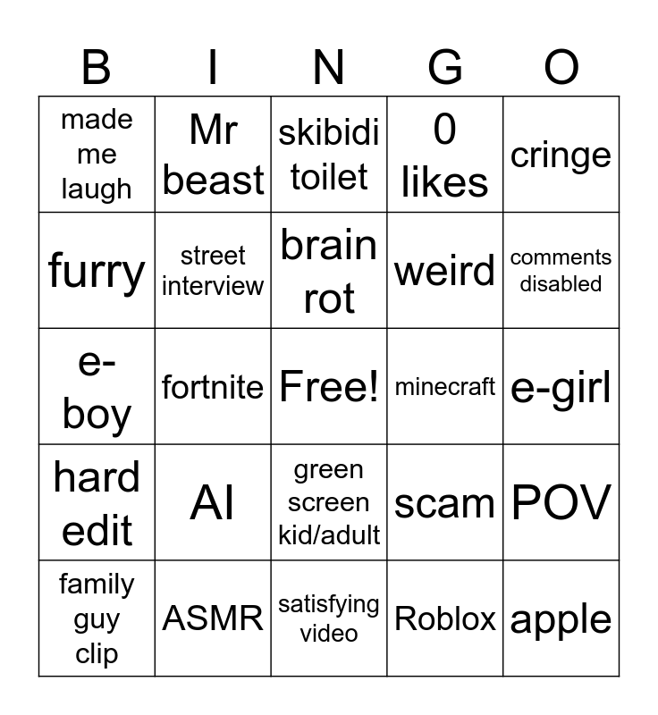 This bingo card has a free space and 24 words: family guy clip, AI, brain rot, Roblox, cringe, made me laugh, Mr beast, skibidi toilet, minecraft, e-girl, e-boy, street interview, scam, POV, furry, ASMR, satisfying video, 0 likes, comments disabled, hard edit, fortnite, green screen kid/adult, weird and apple.
