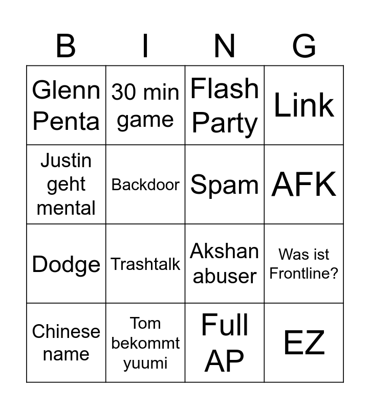 This bingo card has 16 words: Tom bekommt yuumi, Was ist Frontline?, Flash Party, Glenn Penta, Dodge, 30 min game, Akshan abuser, Full AP, Justin geht mental, Backdoor, Chinese name, Link, Trashtalk, AFK, Spam and EZ.