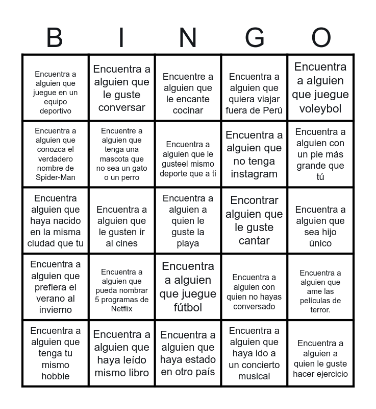 This bingo card has 25 words: Encuentra a alguien que pueda nombrar 5 programas de Netflix, Encuentra a alguien que haya estado en otro país, Encuentra a alguien que le gusteel mismo deporte que a ti, Encuentra a alguien que tenga tu mismo hobbie, Encuentra a alguien que juegue voleybol, Encuentra a alguien que juegue en un equipo deportivo, Encuentra a alguien que conozca el verdadero nombre de Spider-Man, Encuentra a alguien que le guste conversar, Encontrar alguien que le guste cantar, Encuentra a alguien que juegue fútbol, Encuentra a alguien que no tenga instagram, Encuentra alguien que haya nacido en la misma ciudad que tu, Encuentra a alguien con quien no hayas conversado, Encuentra a alguien que ame las películas de terror., Encuentre a alguien que tenga una mascota que no sea un gato o un perro, Encuentra a alguien a quien le guste hacer ejercicio, Encuentra a alguien que sea hijo único, Encuentre a alguien que le encante cocinar, Encuentra a alguien con un pie más grande que tú, Encuentra a alguien que le gusten ir al cines, Encuentra a alguien a quien le guste la playa, Encuentra a alguien que haya leído mismo libro, Encuentra a alguien que prefiera el verano al invierno, Encuentra a alguien que quiera viajar fuera de Perú and Encuentra a alguien que haya ido a un concierto musical.