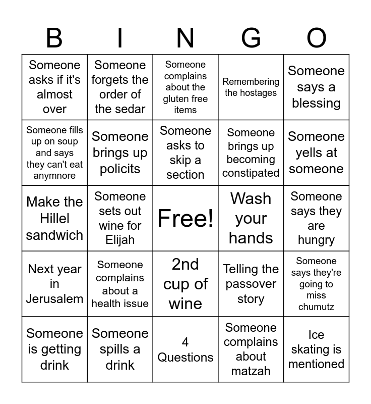 This bingo card has a free space and 24 words: Someone complains about a health issue, Someone spills a drink, Someone asks to skip a section, Someone is getting drink, Someone says a blessing, Someone asks if it's almost over, Someone fills up on soup and says they can't eat anymnore, Someone forgets the order of the sedar, Wash your hands, 2nd cup of wine, Someone brings up becoming constipated, Make the Hillel sandwich, Telling the passover story, Someone says they're going to miss chumutz, Someone brings up policits, Someone complains about matzah, Someone says they are hungry, Someone complains about the gluten free items, Someone yells at someone, Someone sets out wine for Elijah, Ice skating is mentioned, Next year in Jerusalem, Remembering the hostages and 4 Questions.