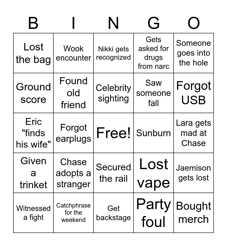 This bingo card has a free space and 24 words: Chase adopts a stranger, Catchphrase for the weekend, Celebrity sighting, Witnessed a fight, Someone goes into the hole, Lost the bag, Ground score, Wook encounter, Sunburn, Secured the rail, Saw someone fall, Eric "finds his wife", Lost vape, Jaemison gets lost, Found old friend, Party foul, Lara gets mad at Chase, Nikki gets recognized, Forgot USB, Forgot earplugs, Bought merch, Given a trinket, Gets asked for drugs from narc and Get backstage.