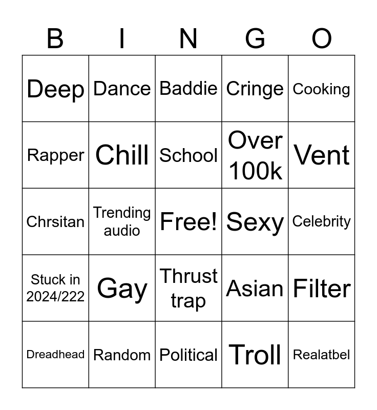 This bingo card has a free space and 24 words: Dreadhead, Gay, School, Troll, Cooking, Deep, Dance, Baddie, Sexy, Celebrity, Chrsitan, Chill, Asian, Filter, Rapper, Random, Political, Cringe, Vent, Stuck in 2024/222, Trending audio, Thrust trap, Over 100k and Realatbel.