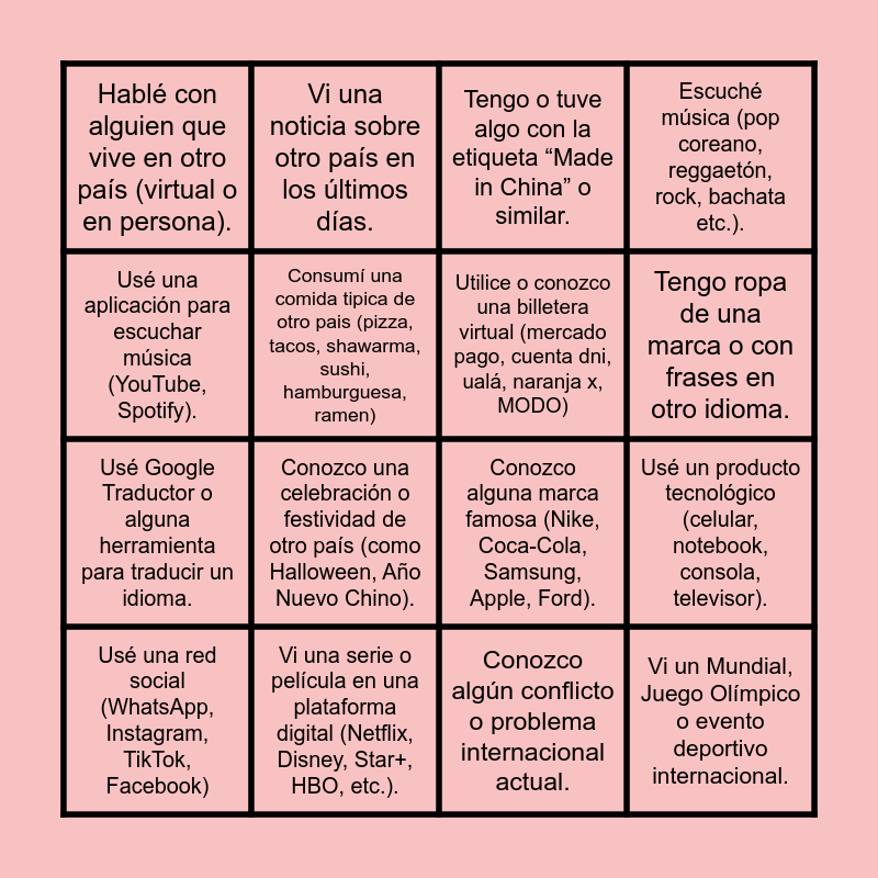 This bingo card has 16 words: Usé una red social (WhatsApp, Instagram, TikTok, Facebook), Vi una serie o película en una plataforma digital (Netflix, Disney, Star+, HBO, etc.)., Tengo o tuve algo con la etiqueta “Made in China” o similar., Escuché música (pop coreano, reggaetón, rock, bachata etc.)., Usé una aplicación para escuchar música (YouTube, Spotify)., Vi una noticia sobre otro país en los últimos días., Conozco alguna marca famosa (Nike, Coca-Cola, Samsung, Apple, Ford)., Usé un producto tecnológico (celular, notebook, consola, televisor)., Hablé con alguien que vive en otro país (virtual o en persona)., Consumí una comida tipica de otro pais (pizza, tacos, shawarma, sushi, hamburguesa, ramen), Conozco algún conflicto o problema internacional actual., Tengo ropa de una marca o con frases en otro idioma., Usé Google Traductor o alguna herramienta para traducir un idioma., Conozco una celebración o festividad de otro país (como Halloween, Año Nuevo Chino)., Utilice o conozco una billetera virtual (mercado pago, cuenta dni, ualá, naranja x, MODO) and Vi un Mundial, Juego Olímpico o evento deportivo internacional..