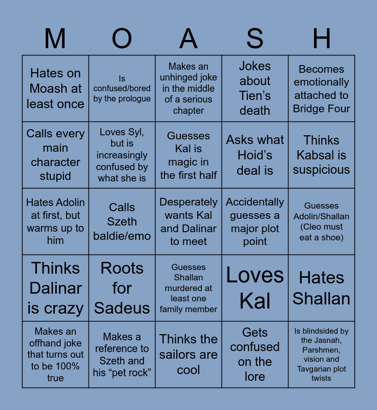 This bingo card has a free space and 24 words: Roots for Sadeus, Makes a reference to Szeth and his “pet rock”, Guesses Kal is magic in the first half, Makes an offhand joke that turns out to be 100% true, Becomes emotionally attached to Bridge Four, Hates on Moash at least once, Calls every main character stupid, Is confused/bored by the prologue, Accidentally guesses a major plot point, Guesses Shallan murdered at least one family member, Asks what Hoid’s deal is, Hates Adolin at first, but warms up to him, Loves Kal, Hates Shallan, Loves Syl, but is increasingly confused by what she is, Gets confused on the lore, Guesses Adolin/Shallan (Cleo must eat a shoe), Makes an unhinged joke in the middle of a serious chapter, Thinks Kabsal is suspicious, Calls Szeth baldie/emo, Is blindsided by the Jasnah, Parshmen, vision and Tavgarian plot twists, Thinks Dalinar is crazy, Jokes about Tien’s death and Thinks the sailors are cool.