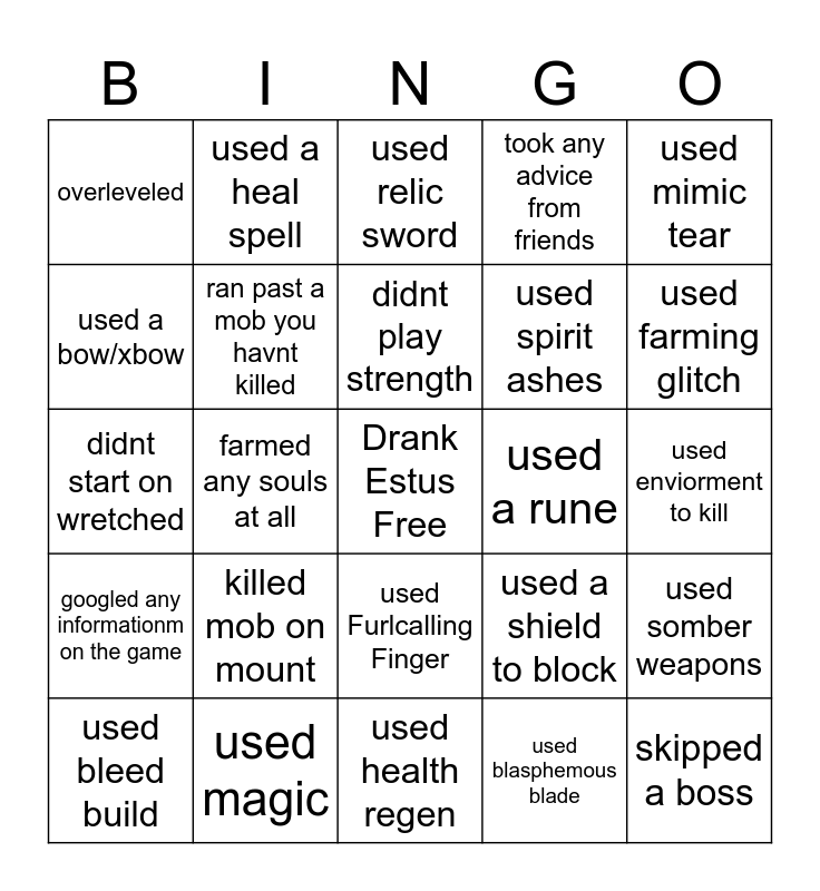 This bingo card has a free space and 24 words: killed mob on mount, used magic, didnt play strength, used bleed build, used mimic tear, overleveled, used a bow/xbow, used a heal spell, used a rune, used Furlcalling Finger, used spirit ashes, didnt start on wretched, used a shield to block, used somber weapons, ran past a mob you havnt killed, used blasphemous blade, used enviorment to kill, used relic sword, used farming glitch, farmed any souls at all, skipped a boss, googled any informationm on the game, took any advice from friends and used health regen.
