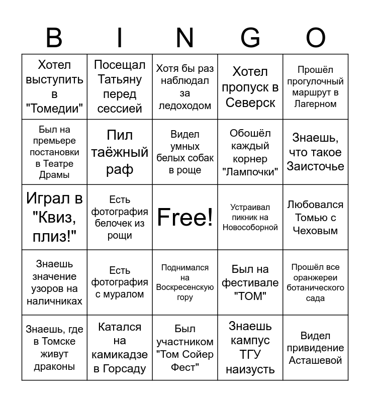 This bingo card has a free space and 24 words: Есть фотография с муралом, Катался на камикадзе в Горсаду, Видел умных белых собак в роще, Знаешь, где в Томске живут драконы, Прошёл прогулочный маршрут в Лагерном, Хотел выступить в "Томедии", Был на премьере постановки в Театре Драмы, Посещал Татьяну перед сессией, Устраивал пикник на Новособорной, Поднимался на Воскресенскую гору, Обошёл каждый корнер "Лампочки", Играл в "Квиз, плиз!", Был на фестивале "ТОМ", Прошёл все оранжереи ботанического сада, Пил таёжный раф, Знаешь кампус ТГУ наизусть, Любовался Томью с Чеховым, Хотя бы раз наблюдал за ледоходом, Знаешь, что такое Заисточье, Есть фотография белочек из рощи, Видел привидение Асташевой, Знаешь значение узоров на наличниках, Хотел пропуск в Северск and Был участником "Том Сойер Фест".
