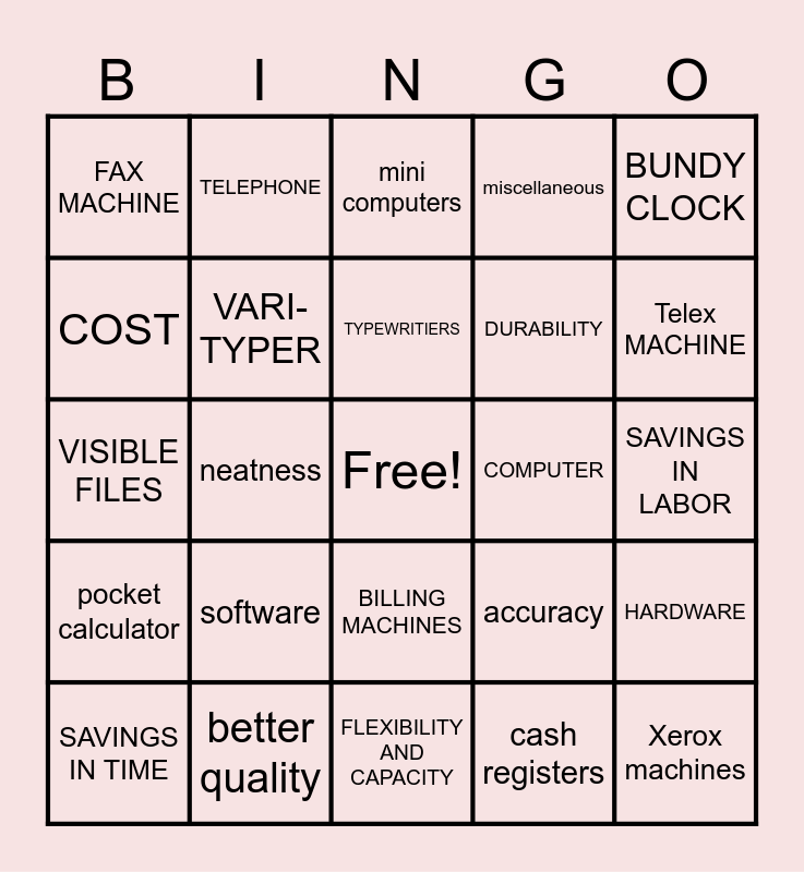 This bingo card has a free space and 24 words: SAVINGS IN TIME, software, TYPEWRITIERS, cash registers, BUNDY CLOCK, FAX MACHINE, TELEPHONE, mini computers, COMPUTER, SAVINGS IN LABOR, VISIBLE FILES, VARI-TYPER, accuracy, HARDWARE, COST, better quality, FLEXIBILITY AND CAPACITY, miscellaneous, Telex MACHINE, pocket calculator, neatness, BILLING MACHINES, DURABILITY and Xerox machines.