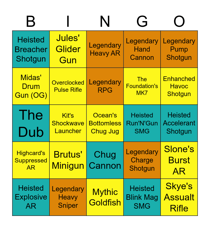 This bingo card has 25 words: Brutus' Minigun, Mythic Goldfish, Legendary RPG, Heisted Explosive AR, Legendary Pump Shotgun, Heisted Breacher Shotgun, Midas' Drum Gun (OG), Jules' Glider Gun, Heisted Run'N'Gun SMG, Chug Cannon, The Foundation's MK7, The Dub, Legendary Charge Shotgun, Slone's Burst AR, Overclocked Pulse Rifle, Skye's Assualt Rifle, Heisted Accelerant Shotgun, Legendary Heavy AR, Enhanched Havoc Shotgun, Kit's Shockwave Launcher, Ocean's Bottomless Chug Jug, Legendary Heavy Sniper, Highcard's Suppressed AR, Legendary Hand Cannon and Heisted Blink Mag SMG.