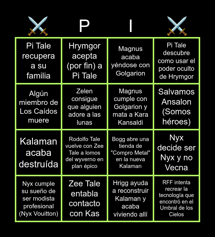 This bingo card has 16 words: Zee Tale entabla contacto con Kas, Nyx decide ser Nyx y no Vecna, Magnus acaba yéndose con Golgarion, Pi Tale recupera a su familia, Kalaman acaba destruída, Hrymgor acepta (por fin) a Pi Tale, Bogg abre una tienda de "Compro Metal" en la nueva Kalaman, Hrigg ayuda a reconstruir Kalaman y acaba viviendo allí, Algún miembro de Los Caídos muere, Zelen consigue que alguien adore a las lunas, Nyx cumple su sueño de ser modista profesional (Nyx Vouitton), Pi Tale descubre como usar el poder oculto de Hrymgor, Rodolfo Tale vuelve con Zee Tale a lomos del wyverno en plan épico, Salvamos Ansalon (Somos héroes), Magnus cumple con Golgarion y mata a Kara Kansaldi and RFF intenta recrear la tecnología que encontró en el Umbral de los Cielos.