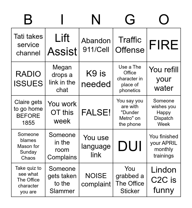 This bingo card has a free space and 29 words: Take quiz to see what The Office character you are, You make a typo and cant edit, You work OT this week, You refer a 911 to non-e, Tati takes service channel, Abandon 911/Cell, Megan drops a link in the chat, Someone in the room Complains, You say you are with "Dunder Metro" on the phone, Someone gets taken to the Slammer, Someone wishes you Happy Dispatch Week, Lindon C2C is funny, NOISE complaint, You grabbed a The Office Sticker, You refill your water, Spillman is lagging, You use language link, Someone blames Mason for Sunday Chaos, FIRE, Claire gets to go home BEFORE 1855, DUI, Someone is calling from OUTSIDE of Utah County, Use a The Office character in place of phonetics, RADIO ISSUES, Traffic Offense, Lift Assist, You finished your APRIL monthly trainings, K9 is needed and Channel Secure!.