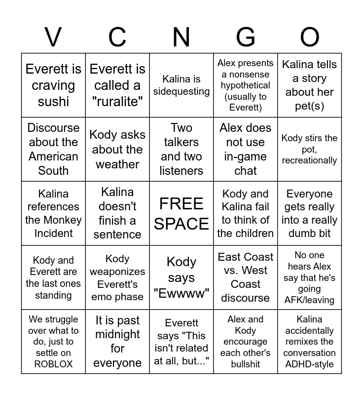 This bingo card has a free space and 24 words: Kody weaponizes Everett's emo phase, It is past midnight for everyone, Two talkers and two listeners, We struggle over what to do, just to settle on ROBLOX, Kalina tells a story about her pet(s), Everett is craving sushi, Discourse about the American South, Everett is called a "ruralite", Kody and Kalina fail to think of the children, Kody says "Ewwww", Alex does not use in-game chat, Kalina references the Monkey Incident, East Coast vs. West Coast discourse, No one hears Alex say that he's going AFK/leaving, Kody asks about the weather, Alex and Kody encourage each other's bullshit, Everyone gets really into a really dumb bit, Kalina is sidequesting, Kody stirs the pot, recreationally, Kalina doesn't finish a sentence, Kalina accidentally remixes the conversation ADHD-style, Kody and Everett are the last ones standing, Alex presents a nonsense hypothetical (usually to Everett) and Everett says "This isn't related at all, but...".