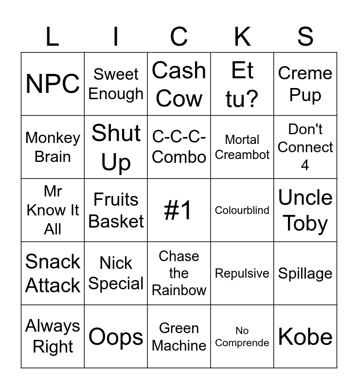 This bingo card has a free space and 24 words: Nick Special, Oops, C-C-C-Combo, Always Right, Creme Pup, NPC, Monkey Brain, Sweet Enough, Colourblind, Chase the Rainbow, Mortal Creambot, Mr Know It All, Repulsive, Spillage, Shut Up, No Comprende, Uncle Toby, Cash Cow, Don't Connect 4, Fruits Basket, Kobe, Snack Attack, Et tu? and Green Machine.