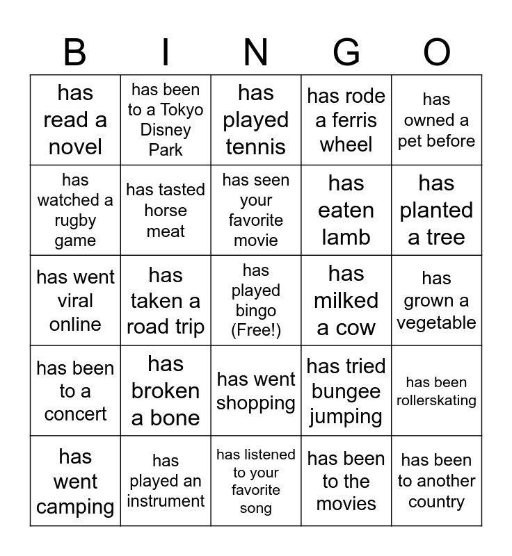 This bingo card has a free space and 26 words: has went shopping, has been to the movies, has seen your favorite movie, has played an instrument, has owned a pet before, has read a novel, has watched a rugby game, has been to a Tokyo Disney Park, has grown a vegetable, has tried bungee jumping, has eaten lamb, has went viral online, has been rollerskating, has went camping, has taken a road trip, has been to Mt. Fuji, has rode a ferris wheel, has been to a concert, has played tennis, has been to another country, has planted a tree, has listened to your favorite song, has milked a cow, has broken a bone, has tasted horse meat and has been to the theater.