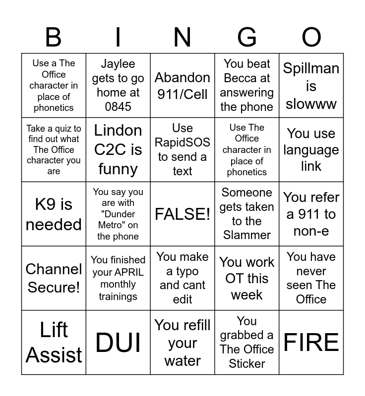 This bingo card has a free space and 29 words: Lift Assist, Someone is calling from OUTSIDE Utah County, You say you are with "Dunder Metro" on the phone, RADIO ISSUES, Use a The Office character in place of phonetics, Abandon 911/Cell, Lindon C2C is funny, You finished your APRIL monthly trainings, Someone gets taken to the Slammer, DUI, You refer a 911 to non-e, FIRE, You refill your water, You grabbed a The Office Sticker, You use language link, Traffic Offense, You make a typo and cant edit, Channel Secure!, Spillman is slowww, K9 is needed, You work OT this week, Someone in the room complains, Use The Office character in place of phonetics, Take a quiz to find out what The Office character you are, You beat Becca at answering the phone, Jaylee gets to go home at 0845, You have never seen The Office, Use RapidSOS to send a text and Use Carbyne.