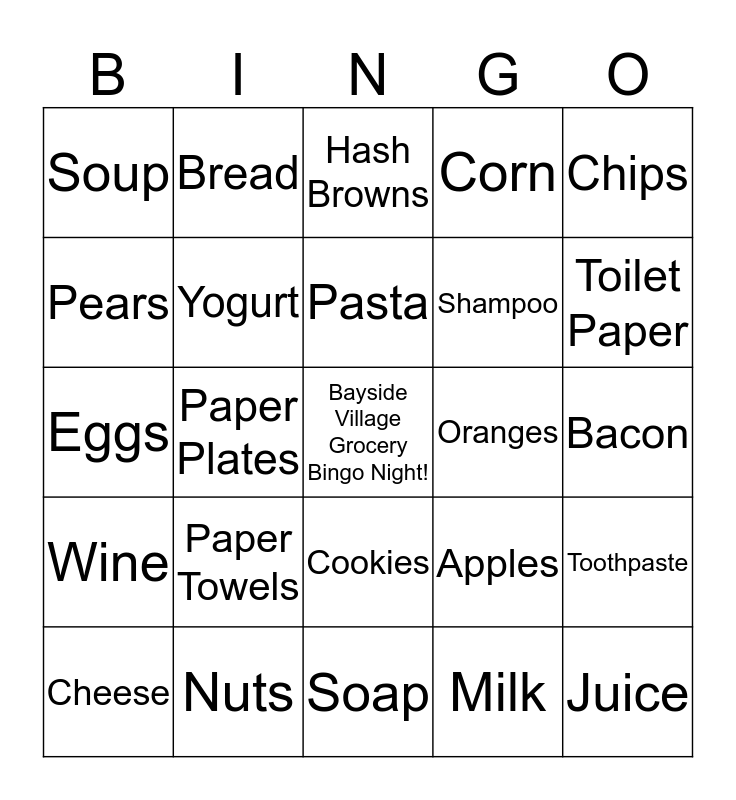 This bingo card has a free space and 24 words: Paper Towels, Nuts, Pasta, Cheese, Chips, Soup, Pears, Bread, Oranges, Cookies, Shampoo, Eggs, Apples, Toothpaste, Yogurt, Milk, Bacon, Hash Browns, Toilet Paper, Paper Plates, Juice, Wine, Corn and Soap.