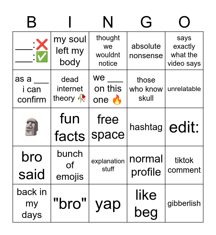 This bingo card has a free space and 24 words: bunch of emojis, "bro", we ___ on this one 🔥, back in my days, says exactly what the video says, ___:❌ ___:✅, as a ___ i can confirm, my soul left my body, hashtag, explanation stuff, those who know skull, 🗿, normal profile, tiktok comment, dead internet theory 🥀, like beg, edit:, thought we wouldnt notice, unrelatable, fun facts, gibberlish, bro said, absolute nonsense and yap.