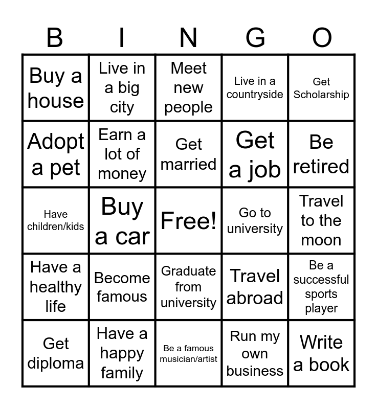 This bingo card has a free space and 24 words: Become famous, Have a happy family, Get married, Get diploma, Get Scholarship, Buy a house, Adopt a pet, Live in a big city, Go to university, Graduate from university, Get a job, Have children/kids, Travel abroad, Be a successful sports player, Earn a lot of money, Run my own business, Travel to the moon, Meet new people, Be retired, Buy a car, Write a book, Have a healthy life, Live in a countryside and Be a famous musician/artist.