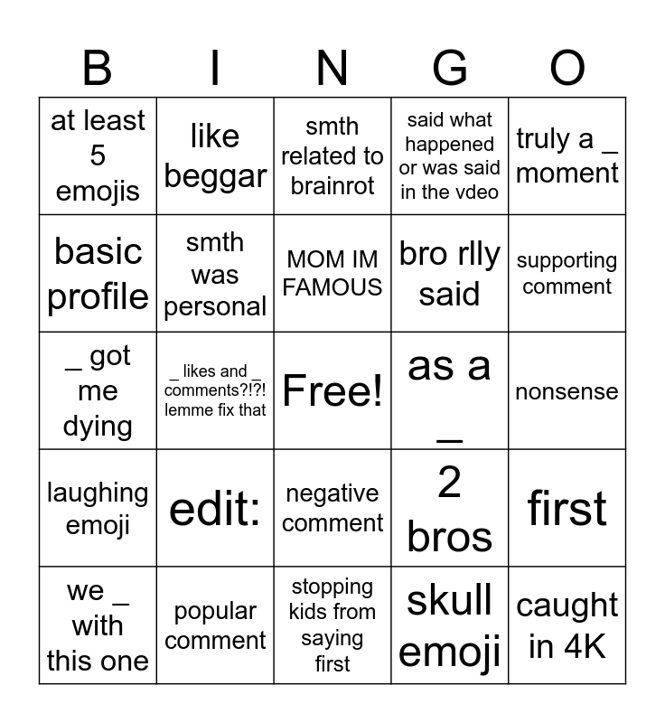 This bingo card has a free space and 24 words: edit:, popular comment, MOM IM FAMOUS, we _ with this one, truly a _ moment, at least 5 emojis, basic profile, like beggar, as a _, negative comment, bro rlly said, _ got me dying, 2 bros, first, smth was personal, skull emoji, nonsense, smth related to brainrot, supporting comment, _ likes and _ comments?!?! lemme fix that, caught in 4K, laughing emoji, said what happened or was said in the vdeo and stopping kids from saying first.