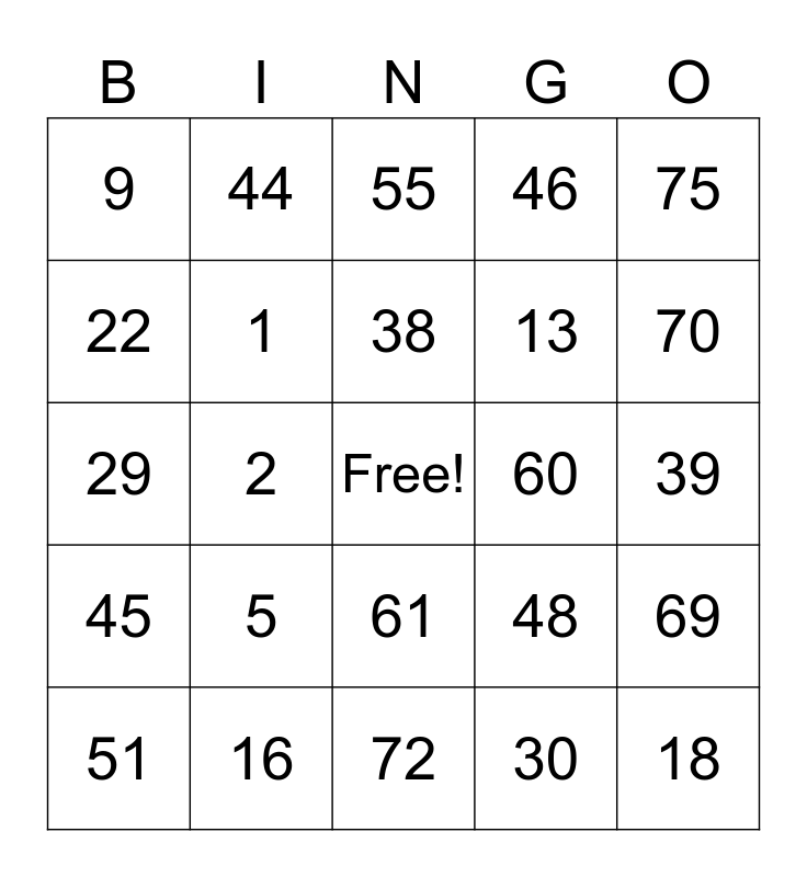 This bingo card has a free space and 24 words: 5, 16, 38, 51, 75, 9, 22, 44, 60, 61, 13, 29, 48, 69, 1, 30, 39, 55, 70, 2, 18, 45, 46 and 72.