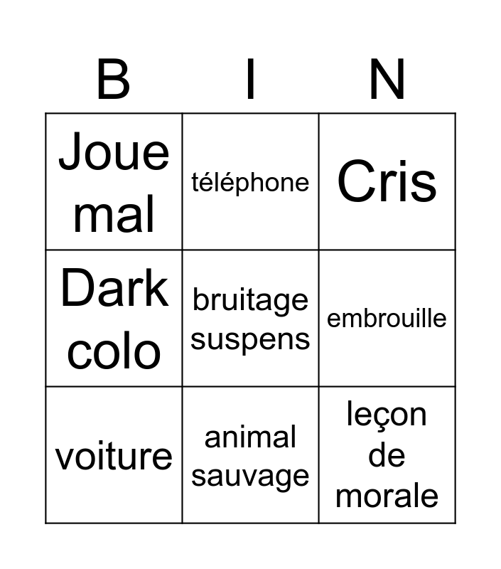 This bingo card has a free space and 8 words: embrouille, Cris, téléphone, voiture, Joue mal, leçon de morale, Dark colo and animal sauvage.
