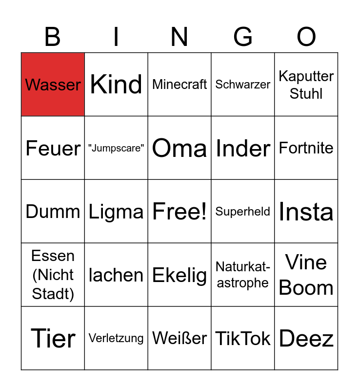 This bingo card has a free space and 24 words: lachen, Verletzung, Oma, Tier, Kaputter Stuhl, Wasser, Feuer, Kind, Superheld, Ekelig, Inder, Dumm, Naturkat-astrophe, Vine Boom, "Jumpscare", TikTok, Insta, Minecraft, Fortnite, Ligma, Deez, Essen (Nicht Stadt), Schwarzer and Weißer.