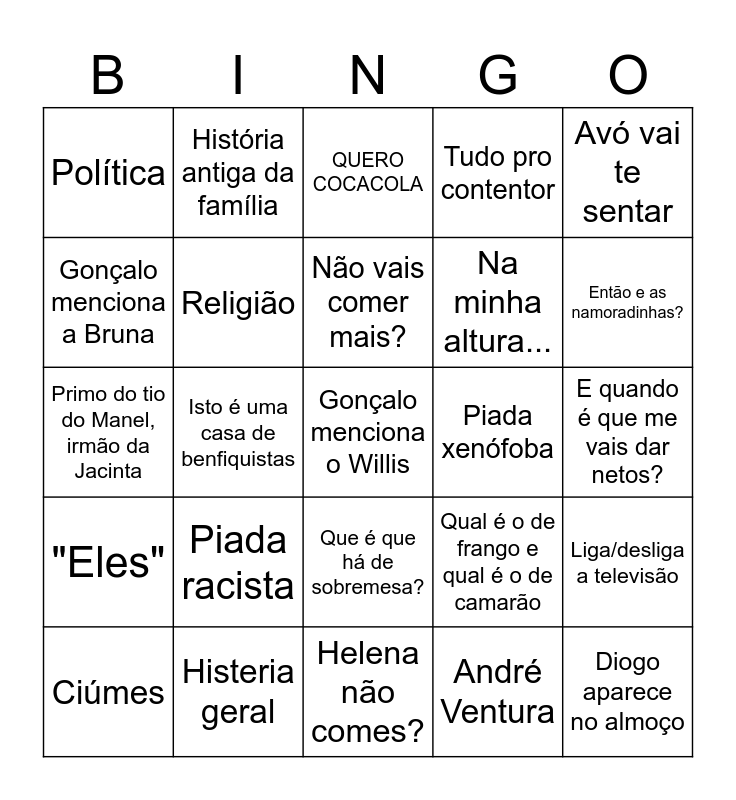 This bingo card has a free space and 24 words: Piada racista, Histeria geral, Não vais comer mais?, Ciúmes, Avó vai te sentar, Política, Gonçalo menciona a Bruna, História antiga da família, Piada xenófoba, Que é que há de sobremesa?, Na minha altura..., Primo do tio do Manel, irmão da Jacinta, Qual é o de frango e qual é o de camarão, Liga/desliga a televisão, Religião, André Ventura, E quando é que me vais dar netos?, QUERO COCACOLA, Então e as namoradinhas?, Isto é uma casa de benfiquistas, Diogo aparece no almoço, "Eles", Tudo pro contentor and Helena não comes?.