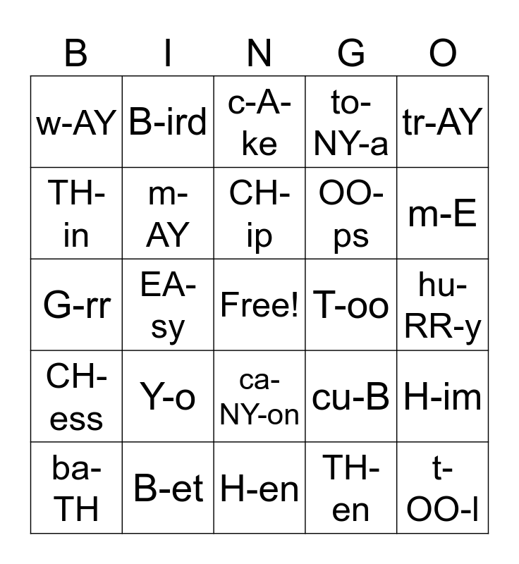 This bingo card has a free space and 24 words: Y-o, B-et, CH-ip, ba-TH, tr-AY, w-AY, TH-in, B-ird, T-oo, ca-NY-on, OO-ps, G-rr, cu-B, H-im, m-AY, TH-en, hu-RR-y, c-A-ke, m-E, EA-sy, t-OO-l, CH-ess, to-NY-a and H-en.