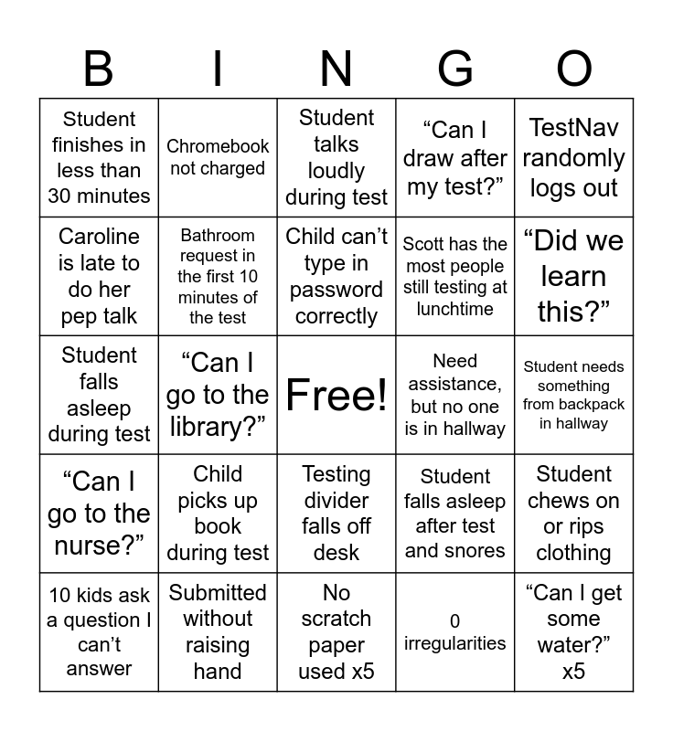 This bingo card has a free space and 24 words: Child picks up book during test, Submitted without raising hand, Child can’t type in password correctly, 10 kids ask a question I can’t answer, TestNav randomly logs out, Student finishes in less than 30 minutes, Caroline is late to do her pep talk, Chromebook not charged, Need assistance, but no one is in hallway, Testing divider falls off desk, Scott has the most people still testing at lunchtime, Student falls asleep during test, Student falls asleep after test and snores, Student chews on or rips clothing, Bathroom request in the first 10 minutes of the test, 0 irregularities, Student needs something from backpack in hallway, Student talks loudly during test, “Did we learn this?”, “Can I go to the library?”, “Can I get some water?” x5, “Can I go to the nurse?”, “Can I draw after my test?” and No scratch paper used x5.