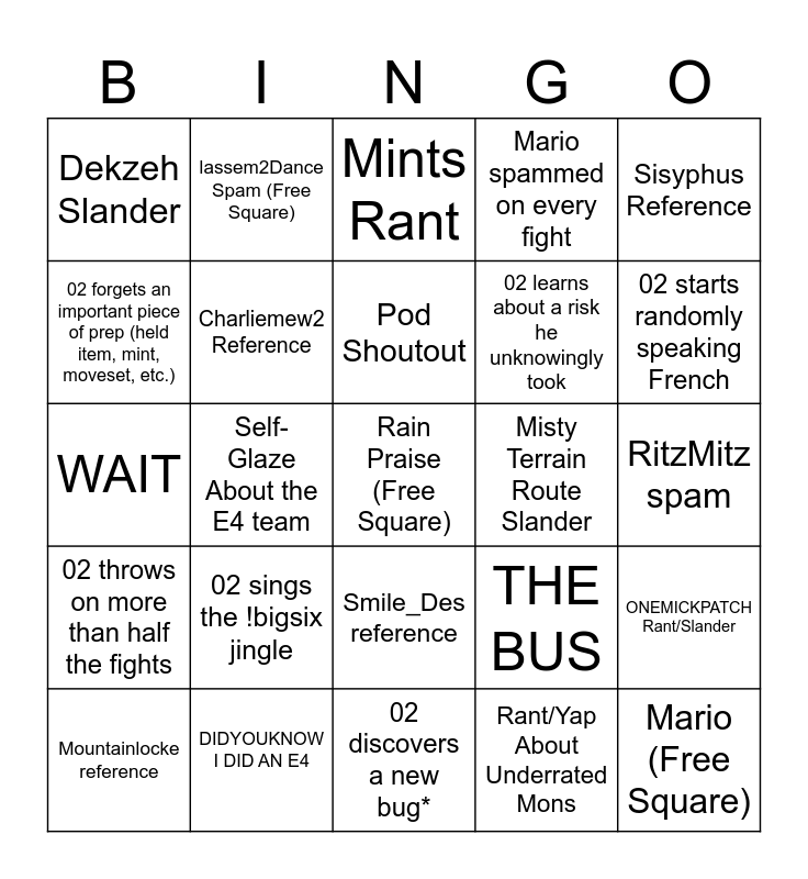 This bingo card has a free space and 40 words: 02 throws on every single fight, WAIT, modconnor shoutout, Charliemew2 Reference, DIDYOUKNOW I DID AN E4, Smile_Des reference, Pod Shoutout, Nuze Cuties Shoutout, Sisyphus Reference, 02 throws on more than half the fights, Self-Glaze About the E4 team, Mario spammed on every fight, Mario (Free Square), RitzMitz spam, Misty Terrain Route Slander, 02 sings the !bigsix jingle, !bigsix, Dekzeh Slander, NG+ Slander, Mints Rant, ONEMICKPATCH Rant/Slander, Rant/Yap About Underrated Mons, 02 learns about a risk he unknowingly took, 02 forgets an important piece of prep (held item, mint, moveset, etc.), Whitney Rant, Drewd Rant, DD attempts to backseat while 02 explicity said chat will be turned off, WAIT, modcon1SlurpMountain, Hoenn Rant/Slander, Talks about a specific encounter that has no correlation to the E4, Mountainlocke reference, !safespace, THE BUS, 02 starts randomly speaking French, 02 discovers a new bug*, New top tier copypasta created, Says a fight is riskless and ends up being wrong, lassem2Dance Spam (Free Square) and Voice goes up two octaves for a running 02 gag.