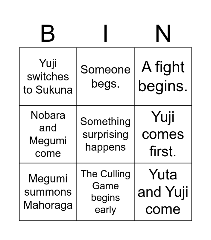 This bingo card has a free space and 8 words: Yuji comes first., A fight begins., Someone begs., Megumi summons Mahoraga, Yuji switches to Sukuna, Yuta and Yuji come, Nobara and Megumi come and The Culling Game begins early.