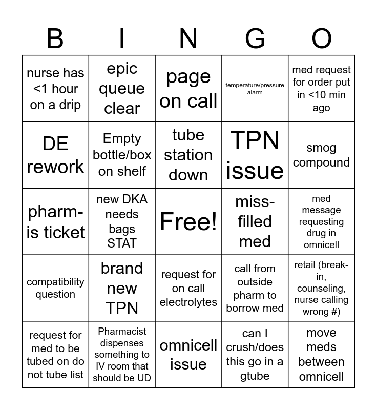 This bingo card has a free space and 58 words: survanta, Pharmacist dispenses something to IV room that should be UD, Nurse asks how long to run drug over, compatibility question, can I crush/does this go in a gtube, call out/or >10 min late, Empty bottle/box on shelf, Med message for missing cartfill item, TPN issue, alteplase, temperature/pressure alarm, D/C TPN, IV hoarding stats, code response needed, picu missing med, nurse has <1 hour on a drip, move meds between omnicell, med request for order put in <10 min ago, need med from central or nurse requesting item that comes from central, tube station down, miss-filled med, page on call, request for med to be tubed on do not tube list, retail (break-in, counseling, nurse calling wrong #), call to borrow a med, med message requesting drug in omnicell, need new tackle box, expired compound, smog compound, page or call NNP, rec from a consult service, med sent secure returns in tube, omnicell discrepancy, med not scanning (doseedge or nurse call), trauma B/stab code/OB c-section, expired med (not compound), call from OR, new DKA needs bags STAT, pharm-is ticket, doseedge bypass, brand new TPN, new LOS/EOS orders, call from outside pharm to borrow med, request for vaccine, recon antibiotic, ID home med, status board clear, request for on call electrolytes, omnicell issue, med message requesting med scanned into med bin, phone call from MD needing dose recommendation, critical dose warning override, need to make dilution narc, nurse asks for med to be approved, epic queue clear, Door bell to pharmacy, DE rework and need to waste for a narc.