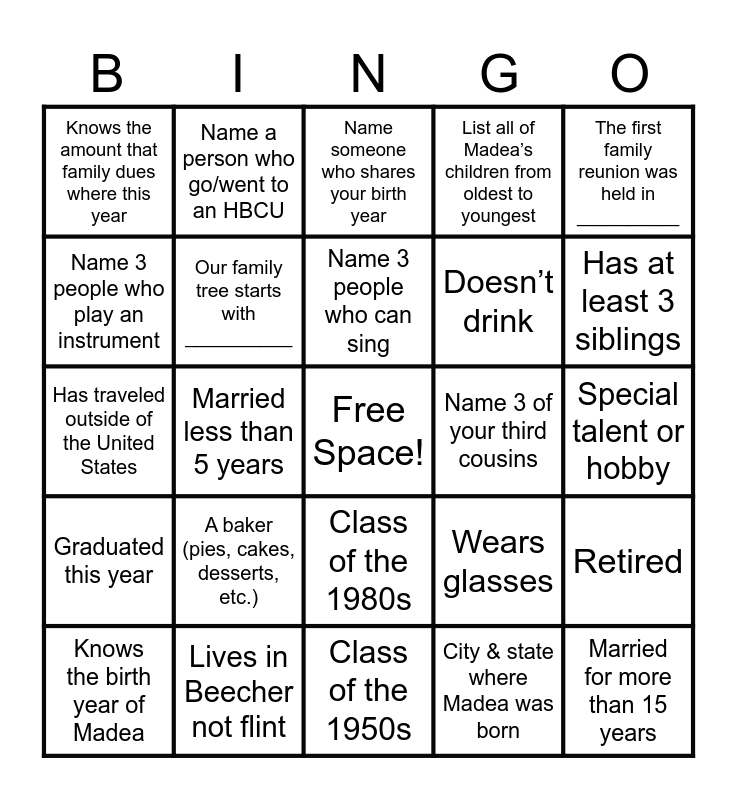 This bingo card has a free space and 60 words: Didn’t attend a flint school, Lives in Beecher not flint, Attended last years reunion, Graduated this year, City & state where Madea was born, Rides motorcycles, Our family tree starts with __________, Name 1 person who has lived overseas, Doesn’t drink, Name someone who serve, or served, in the armed forces, List all of Madea’s children from oldest to youngest, Has 3 generations represented at this year's reunion, Name 3 people who play an instrument, Doesn’t smoke, Name 2 family members who share a birthday month with you, Knows the amount that family dues where this year, Married for more than 15 years, The first family reunion was held in __________, Name an only child, Name 3 people who can sing, Name 3 of your third cousins, Name someone who shares your birth year, Knows the birth year of Madea, Retired, Name 3 people who have more than 2 grandchildren, Name of our family patriarch, Name the "most seasoned" person at the reunion this year (oldest attendee), Name the "least seasoned" person at the reunion (youngest attendee), Has at least 3 siblings, Shares a name with a family ancestor, Name 3 people who are the youngest sibling, A grill master, Know and can name at least 5 people at the reunion, Name 1 set of twins in the family, Name a person who go/went to an HBCU, Has at least one pet, Knows the 23rd Psalm, Married less than 5 years, Married more than 20 years, Has traveled outside of the United States, July birthday!, A baker (pies, cakes, desserts, etc.), Special talent or hobby, Is left handed, Wears glasses, Under the age of 21, Lived in at least 3 US States, Lived in at least 3 US Cities, List the last names of 3 family members at this reunion, Class of the 1980s, Class of the 1950s, Class of the 1960s, Class of the 1970s, Class of the 1990s, Class of the 2000s, Class of the 2010s, Class of the 2020s, Class of the 1940s, Speaks and/or knows more than 1 language and Plays or played an organized sport.