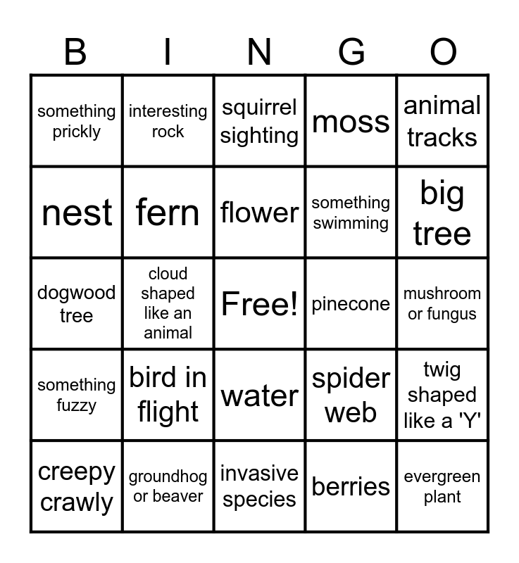 This bingo card has a free space and 24 words: bird in flight, groundhog or beaver, flower, creepy crawly, animal tracks, something prickly, nest, interesting rock, pinecone, water, something swimming, dogwood tree, spider web, twig shaped like a 'Y', fern, berries, mushroom or fungus, squirrel sighting, big tree, cloud shaped like an animal, evergreen plant, something fuzzy, moss and invasive species.