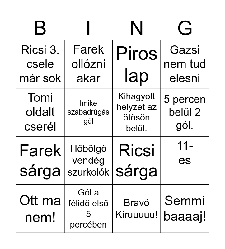 This bingo card has 16 words: Gól a félidő első 5 percében, 11-es, Piros lap, Ricsi 3. csele már sok, Farek sárga, Farek ollózni akar, Ricsi sárga, Bravó Kiruuuuu!, Tomi oldalt cserél, Imike szabadrúgás gól, Ott ma nem!, Gazsi nem tud elesni, Hőbölgő vendég szurkolók, 5 percen belül 2 gól., Kihagyott helyzet az ötösön belül. and Semmi baaaaj!.