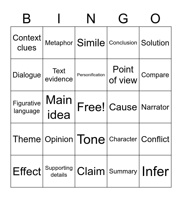 This bingo card has a free space and 24 words: Opinion, Supporting details, Personification, Effect, Solution, Context clues, Dialogue, Metaphor, Cause, Tone, Point of view, Figurative language, Character, Conflict, Text evidence, Summary, Narrator, Simile, Compare, Main idea, Infer, Theme, Conclusion and Claim.