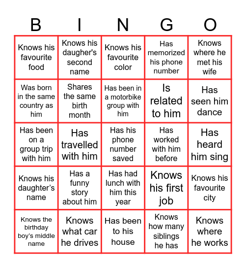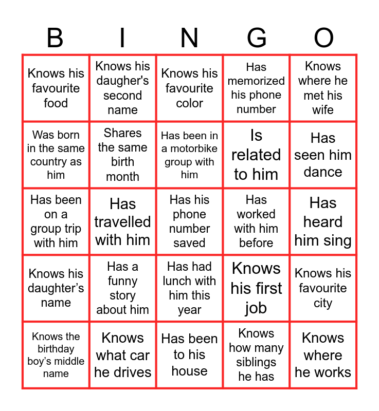 This bingo card has a free space and 29 words: Knows the birthday boy’s middle name, At his wedding, Has travelled with him, Has known him for more than 10 years, Knows his favourite food, Knows his favourite color, Shares the same birth month, Has a funny story about him, Has worked with him before, Knows what car he drives, Has heard him sing, Knows where he works, Has been to his house, Knows how many siblings he has, Has seen him dance, Has seen him angry, Has had lunch with him this year, Knows his daughter’s name, Knows where he met his wife, Has been on a group trip with him, Knows his first job, Has taken a selfie with him, Is related to him, Was born in the same country as him, Has memorized his phone number, Knows his daugher's second name, Knows his favourite city, Has been in a motorbike group with him and Knows what his favourite salad is.