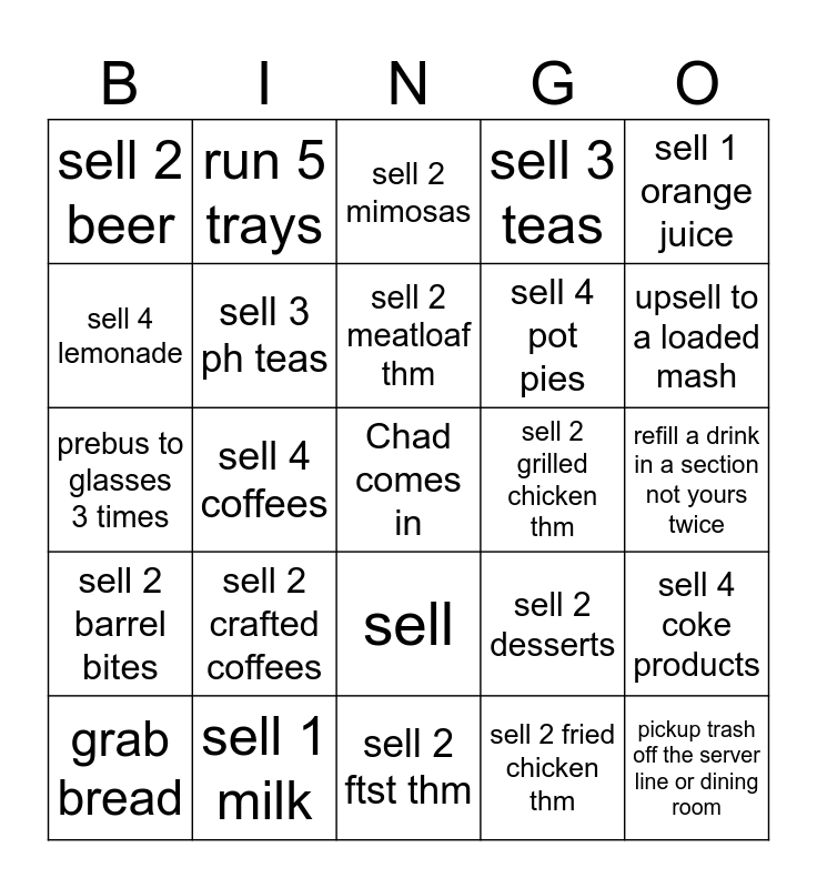 This bingo card has a free space and 24 words: sell 2 crafted coffees, sell 1 milk, sell 2 meatloaf thm, grab bread, sell 1 orange juice, sell 2 beer, sell 4 lemonade, run 5 trays, sell 2 grilled chicken thm, sell, sell 4 pot pies, prebus to glasses 3 times, sell 2 desserts, sell 4 coke products, sell 3 ph teas, sell 2 fried chicken thm, refill a drink in a section not yours twice, sell 2 mimosas, upsell to a loaded mash, sell 4 coffees, pickup trash off the server line or dining room, sell 2 barrel bites, sell 3 teas and sell 2 ftst thm.