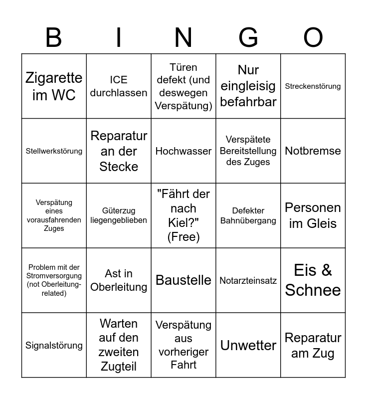 This bingo card has a free space and 27 words: Notarzteinsatz, Polizeieinsatz, Verspätete Bereitstellung des Zuges, Verspätung aus vorheriger Fahrt, Stellwerkstörung, Türen defekt (und deswegen Verspätung), ICE durchlassen, Problem mit der Stromversorgung (not Oberleitung-related), Defekter Bahnübergang, Eis & Schnee, Verspätung eines vorausfahrenden Zuges, Nur eingleisig befahrbar, Signalstörung, Warten auf den zweiten Zugteil, Notbremse, Kurzfristiger Personalausfall, Reparatur an der Stecke, Hochwasser, Ast in Oberleitung, Zigarette im WC, Personen im Gleis, Unwetter, Güterzug liegengeblieben, Reparatur am Zug, Baustelle, Streckenstörung and Schafe (Tiere) im Gleis.