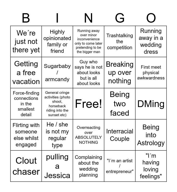 This bingo card has a free space and 24 words: He / she is not my regular type, pulling a Jessica, Guy who says he is not about looks but is all about looks, Clout chaser, Running away in a wedding dress, We´re just not there yet, Getting a free vacation, Highly opinionated family or friend, Being two faced, Overreacting over ABSOLUTELY NOTHING, Breaking up over nothing, Force-finding connections in the smallest detail, Interracial Couple, Being into Astrology, Sugarbaby / armcandy, "I´m an artist / entrepreneur", DMing, Running away over minor inconvenience only to come later pretending to be the bigger man, First meet physical awkwardness, General cringe activities (photo shoot, horseback riding into the sunset etc), "I´m having loving feelings", Flirting with someone else whilst engaged, Trashtalking the competition and Complaining about the wedding planning.
