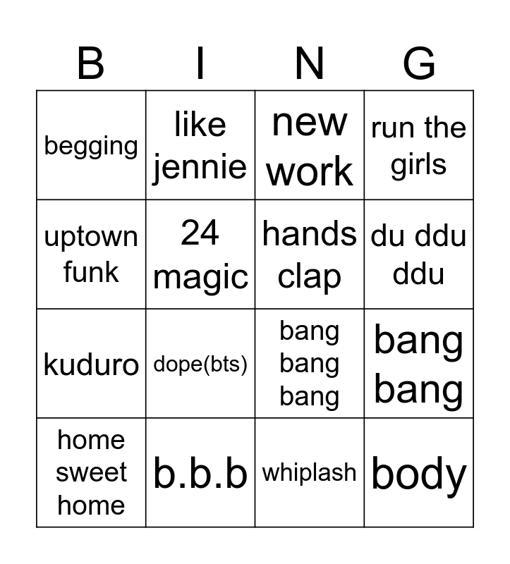 This bingo card has 16 words: b.b.b, bang bang, new work, begging, kuduro, like jennie, bang bang bang, whiplash, uptown funk, 24 magic, home sweet home, run the girls, dope(bts), du ddu ddu, hands clap and body.