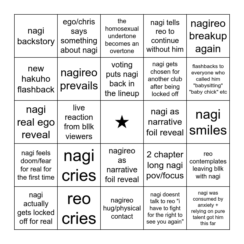 This bingo card has a free space and 24 words: nagi cries, reo cries, voting puts nagi back in the lineup, nagi actually gets locked off for real, nagireo breakup again, nagi backstory, new hakuho flashback, ego/chris says something about nagi, nagi as narrative foil reveal, nagireo as narrative foil reveal, nagi gets chosen for another club after being locked off, nagi real ego reveal, 2 chapter long nagi pov/focus, reo contemplates leaving bllk with nagi, nagireo prevails, nagi doesnt talk to reo "i have to fight for the right to see you again", nagi smiles, the homosexual undertone becomes an overtone, flashbacks to everyone who called him "babysitting" "baby chick" etc, live reaction from bllk viewers, nagi was consumed by anxiety + relying on pure talent got him this far, nagi feels doom/fear for real for the first time, nagi tells reo to continue without him and nagireo hug/physical contact.