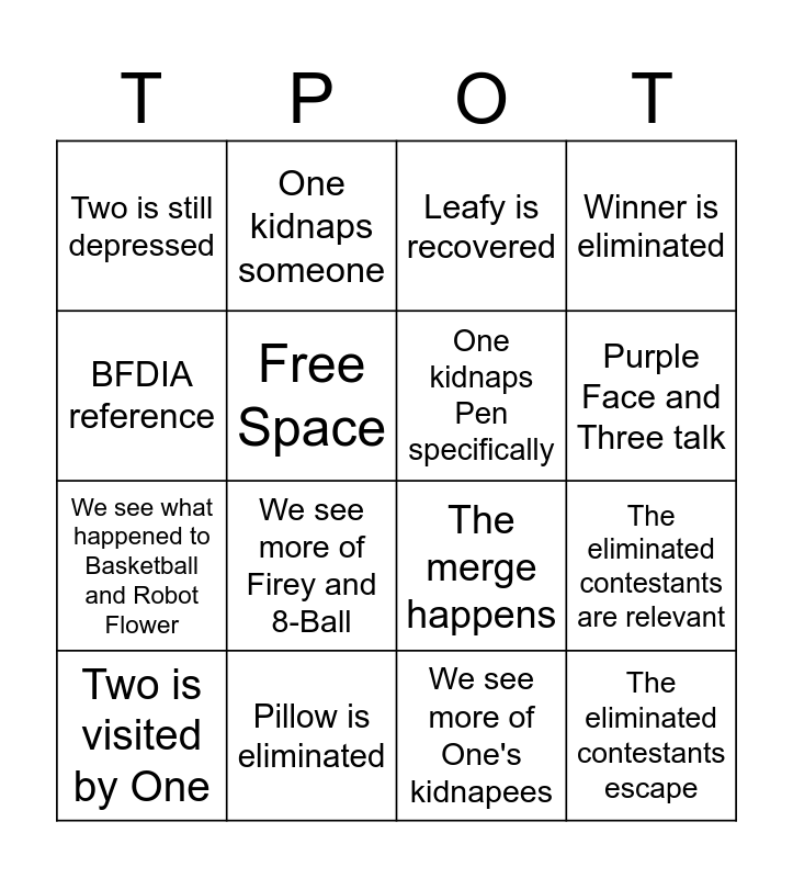 This bingo card has 16 words: Pillow is eliminated, The eliminated contestants are relevant, Leafy is recovered, Two is still depressed, We see what happened to Basketball and Robot Flower, One kidnaps someone, The merge happens, We see more of One's kidnapees, BFDIA reference, Free Space, Two is visited by One, Winner is eliminated, We see more of Firey and 8-Ball, Purple Face and Three talk, One kidnaps Pen specifically and The eliminated contestants escape.